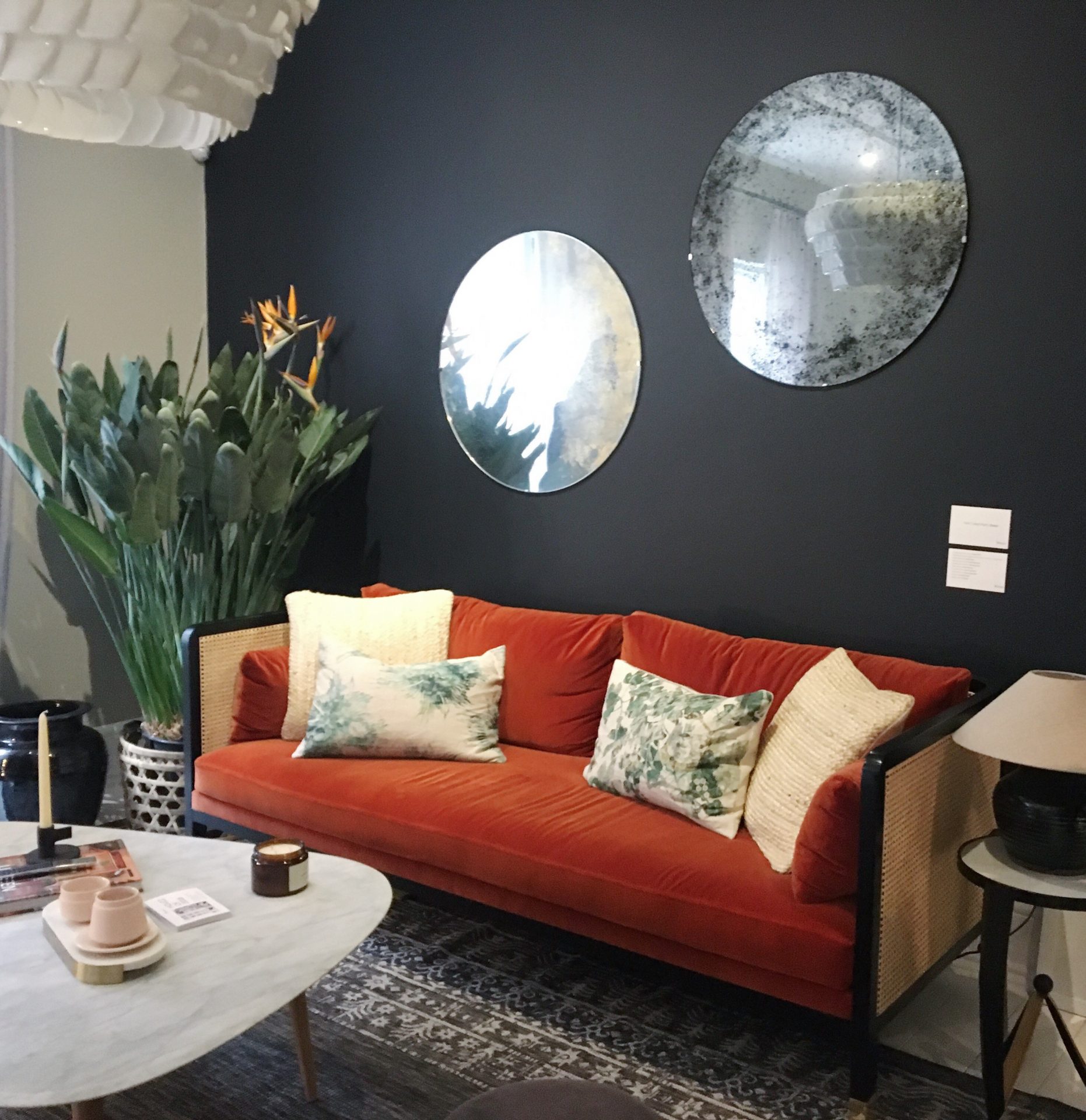 The first room of the property to enter was the Living Room; catching your attention immediately is the 1970’s vibe, Fox Orange sofa by Red Edition France. This soft, warm and burnt orange colour, in a plush velvety texture is heavily contrasted by the backdrop of the wall-covering’s matte dark inky blue paint (colour; Cobalt Blue, by Dulux Trade). Automatically this room has modernised retro interiors, to create a cosy but contemporary space. Enhancing light and maximising perceptions of space were the antique crackled metals mirrors, positioned diagonally on the wall and these were perfectly paired with a large floor plant by Patch (in a funky large, woven mono ceramic pot). Additional accessories and finishing touches such as these enabled the darkness of the room to feel relaxing but also created a refreshing and natural ambience, simultaneously.